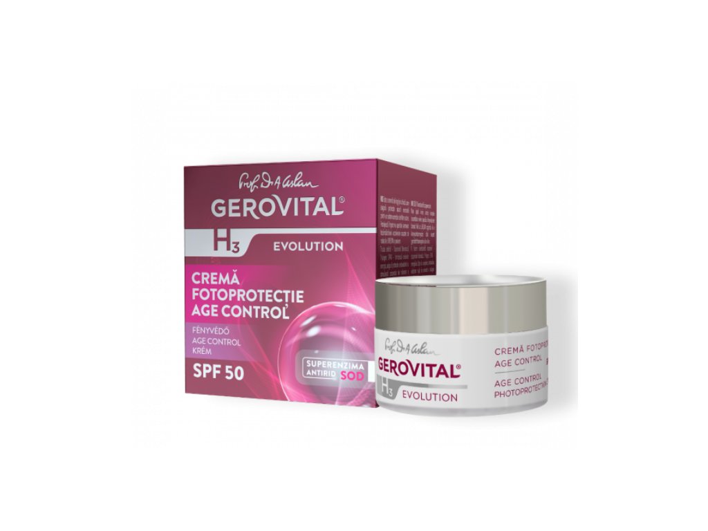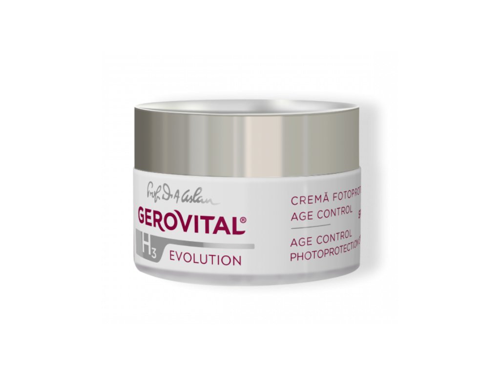 Gerovital H3 Prof. Dr. Ana Aslan Evolution Age Control Fotoochranný krém s efektem proti vráskám SPF 50 obsahuje komplexní systém UVB/UVA filtrů, které chrání pleť před slunečním zářením a znečišťujícími látkami z prostředí a zabraňují vzniku známek zrychleného fotostárnutí. Triáda proti vráskám – superoxiddismutáza, Trylagen, GP4G – dodává buňkám energii, poskytuje antioxidační ochranu a stimuluje procesy obnovy kolagenu.
